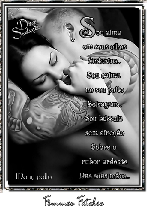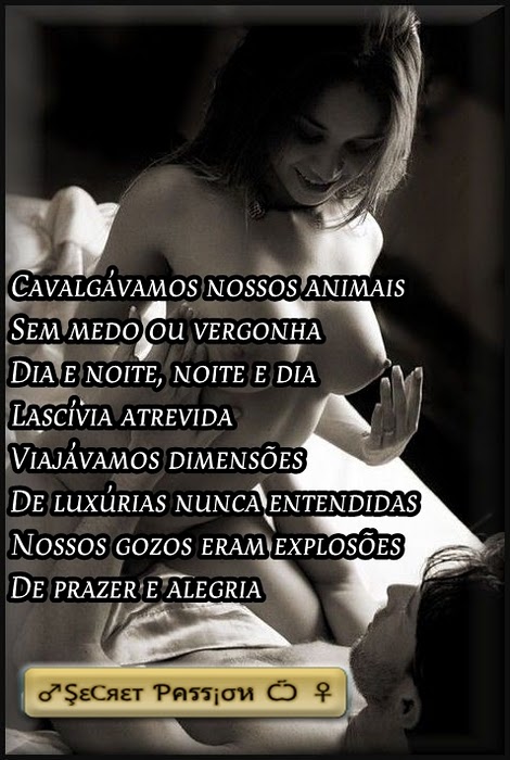 Alucinada, me entrego aos Teus mais loucos e inconseqüentes, desejos Sinto Teu peso sobre meu corpo... Domando-me Arrancando suspiros.... Suas mãos másculas, pesadas, abrindo minha gruta molhada Tua língua me fazendo delirar Umedecendo tua boca... ao possuir-me docemente Em êxtase perdemos o controle